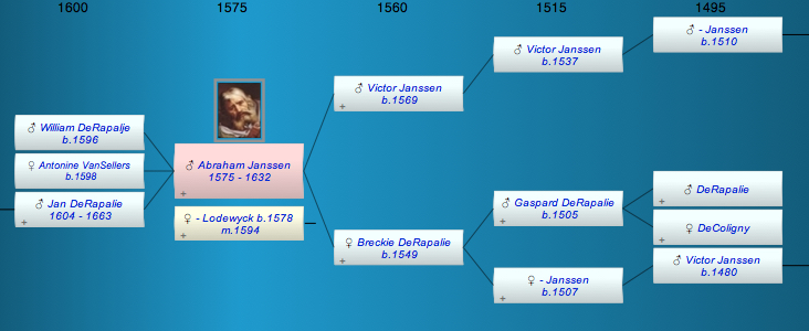 | 1596 | 21 | Birth of son William Janssen DeRapalje | Antwerp, Belgium | ||